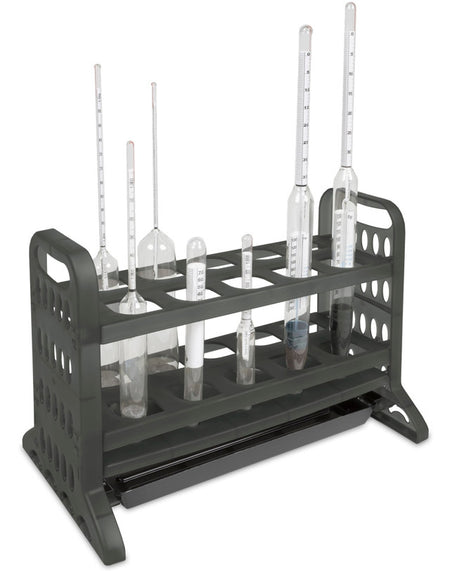 Securely store, dry, and transport fragile hydrometers with this durable 10-place Hydrometer Rack, designed for both laboratory and industrial use. Featuring teardrop-shaped slots that accommodate hydrometers up to 31 mm in diameter, this rack provides a stable and organized solution for handling delicate glass instruments. Its 3-tier design ensures enhanced stability and protection, while the removable drip tray simplifies cleaning and improves sanitation. Built-in handles offer a convenient grip for safe transport, making it ideal for labs, breweries, and educational institutions. Constructed from high-quality polypropylene, this lightweight rack is long-lasting, easy to clean, and fully recyclable.