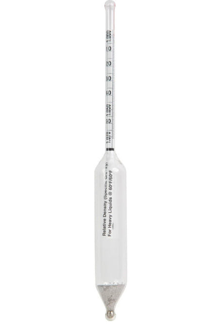 Ultra Precision Specific Gravity Hydrometers measure the ratio of the mass of a solid or liquid to the mass of an equal volume of distilled water. These hydrometers feature smaller ranges but with higher resolution and have all been calibrated for use at 60°F.