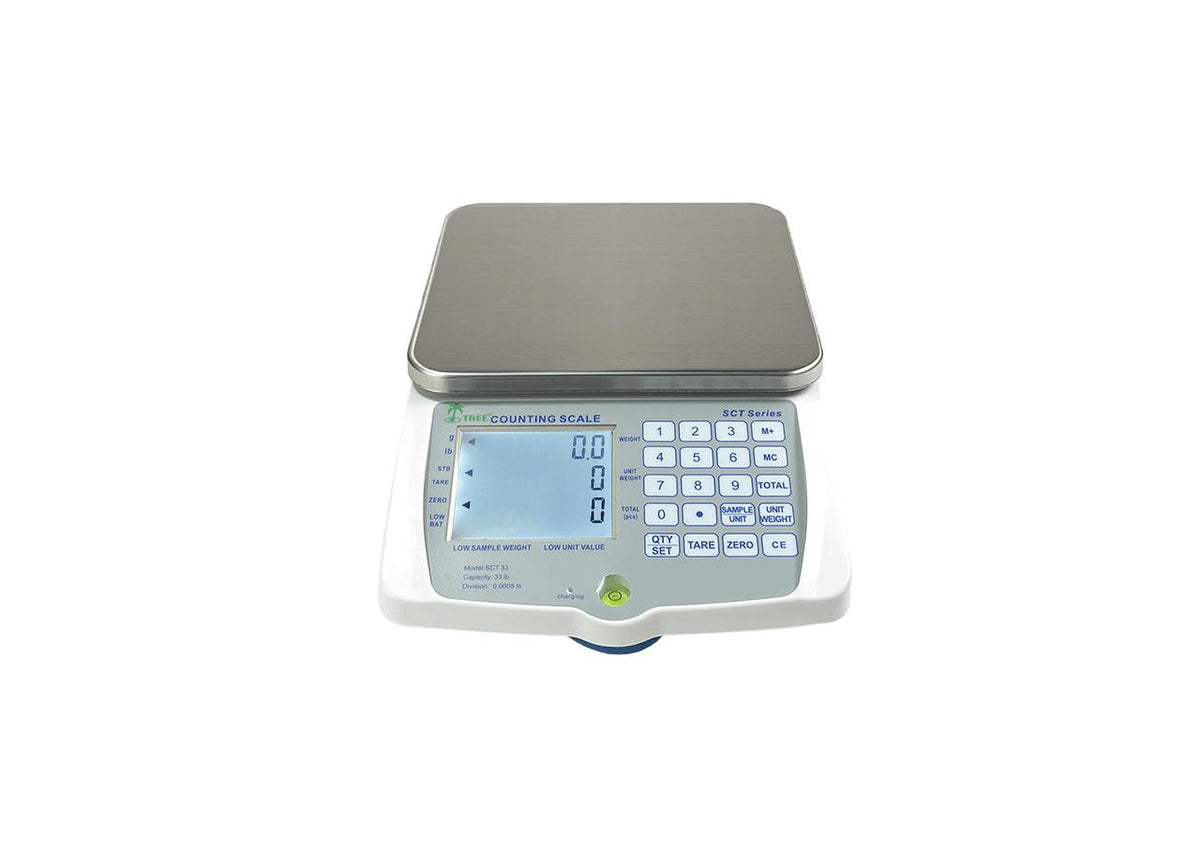 Tree counting scales offer an economical solution for industrial and manufacturing parts counting. The SCT small counting scale provides a variety of features suitable for small parts counting, packaging, sorting and inventory. The large LCD display is easy to read and displays weight, unit weight and count all on one screen. The full numeric keypad allows for easy entry of sample counts. The SCT has a very useful hi/lo check function by count. A rechargeable internal battery improves portability and included AC adapter allows continuous use on a bench.